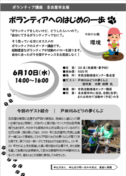 | 申込方法 | 市民活動推進センターの窓口、電話、FAX、Emailにてお申込みください。 ●希望講座:6/10(水)ボランティア講座「ボランティアへのはじめの一歩」 ●お名前(フリガナ): ●所属団体(あれば): ●電話番号: ●FAX番号(あれば): ●参加動機: T E L :052-228-8039 FAX:052-228-8073 E-mail:npo@sportsshimin.city.nagoya.lg.jp |